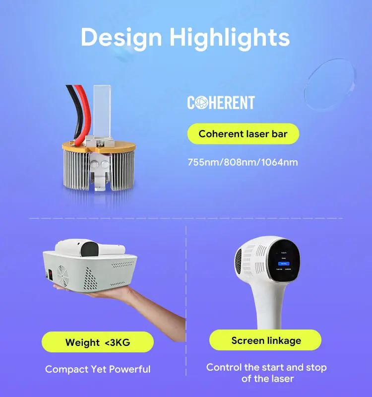 Advantage of portable 808nm diode laser painles epilation machine: 1.Coherent laser bar (755nm/808nm/1064nm),Stable performance, strong energy and long service life;