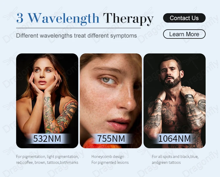 3 wavelength therapy- Different wavelengths treat different symptoms 532nm- For pigmentation, light pigmentation ,red , coffee, brown , tattoos,birthmarks. 755nm-Honeycomb design for pigmented lesions.