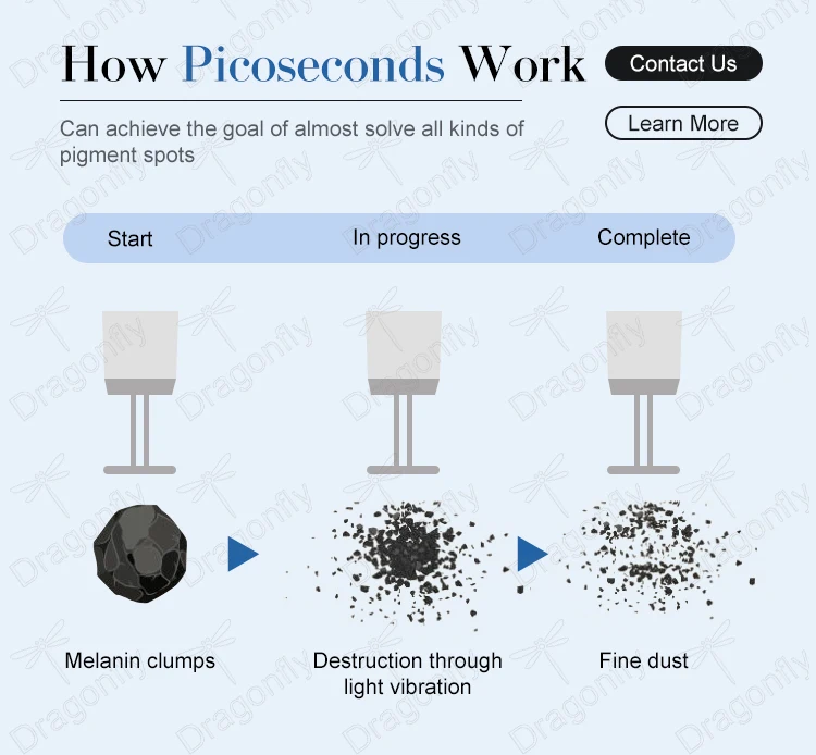 The Picosecond laser uses ultra-short pulses (one trillionth of a second in length)to hit the melanin with great pressure, the melanin shatters into tiny dust-like particles, Because the particles are so small, they are more readilyabsorbed and eliminated by the body. it willsignificantly reduce postoperative swelling melanin precipitate phenomenon.
